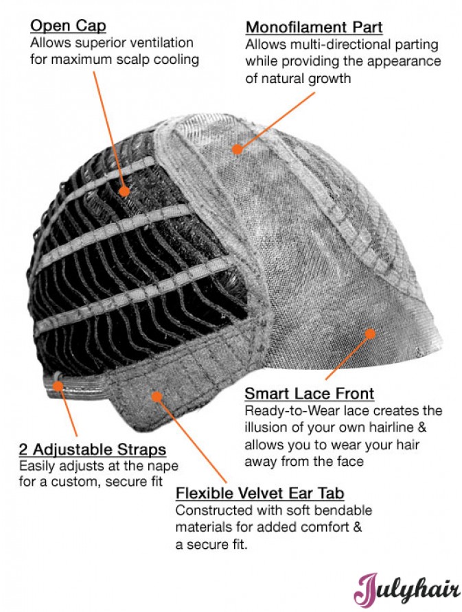 To ensure that the wig is airy, the main body has OPEN WEFTS. This means that the hair has been stitched by machine onto very thin strips of elasticated material. This design ensures that the wig is cool & lightweight.