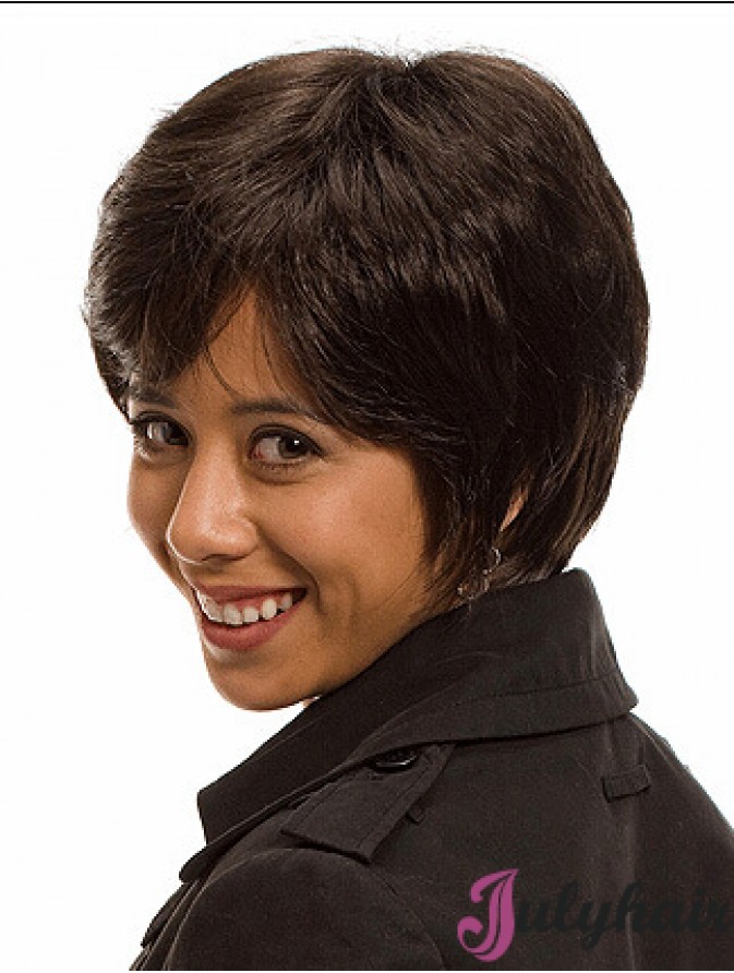 Brown 16inch Straight Long With Bangs Sleek Human Hair Wigs