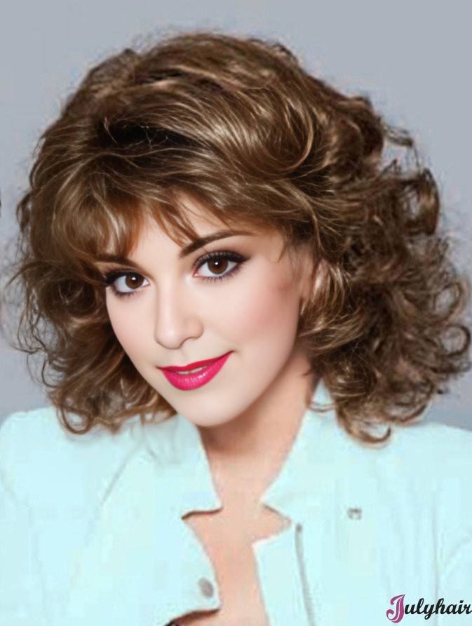 No-Fuss Brown Shoulder Length Curly With Bangs Lace Front Wigs