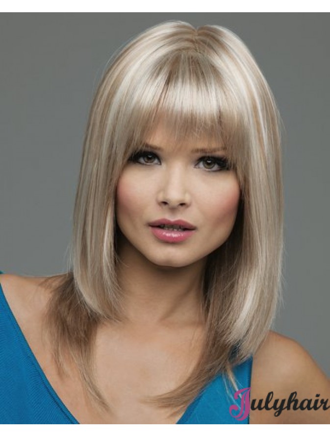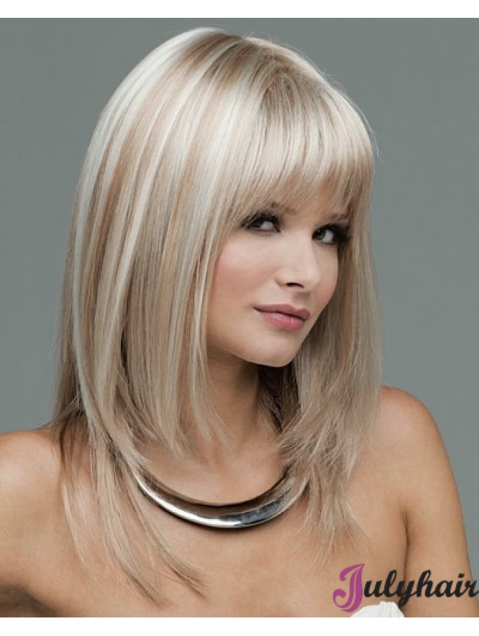 Straight With Bangs Shoulder Length Blonde Natural Lace Front Wigs