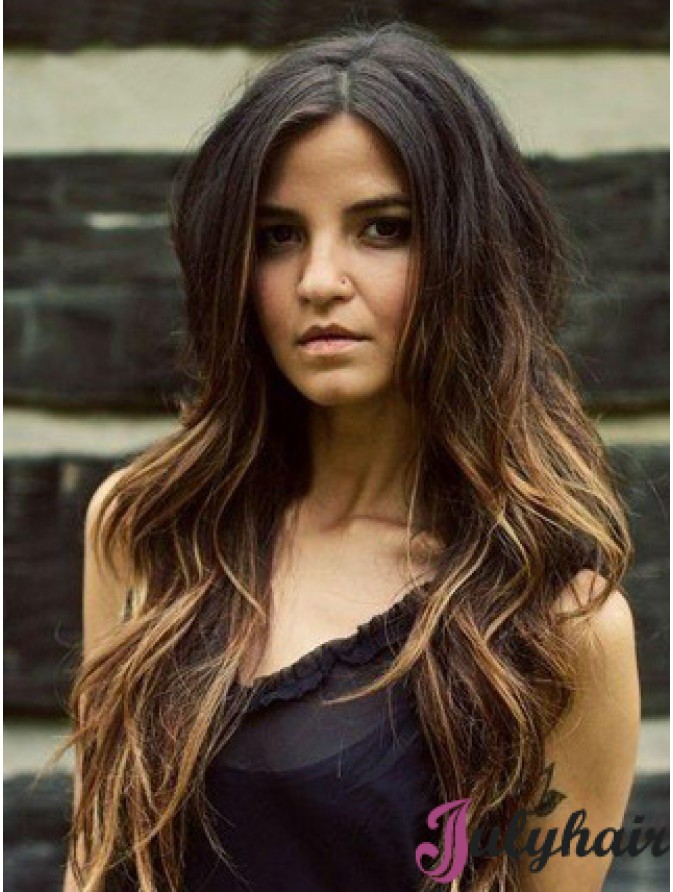 Long Ombre/2 Tone Wavy Without Bangs Fashionable African American Wigs