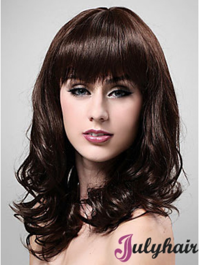 Shoulder Length With Bangs 20 inch Wavy Brown Medium Wigs