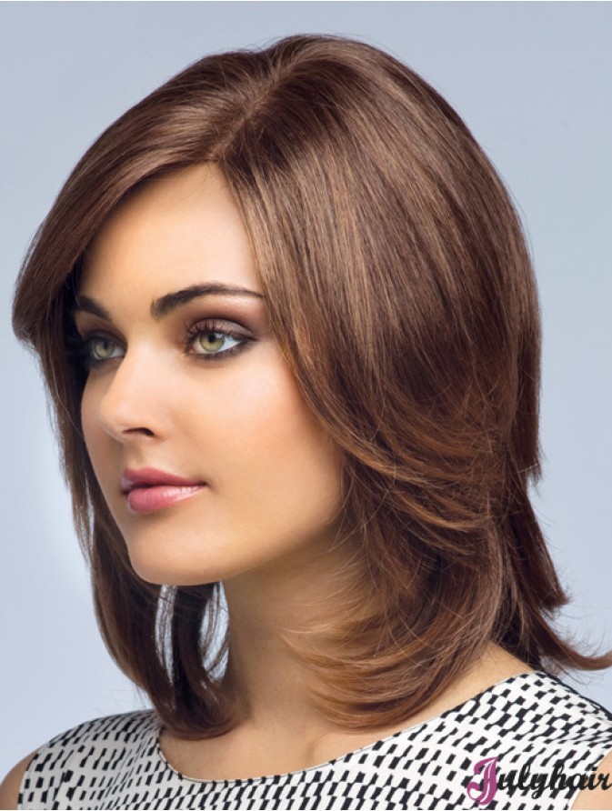 Wavy With Bangs Shoulder Length Brown Durable Lace Front Wigs